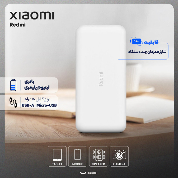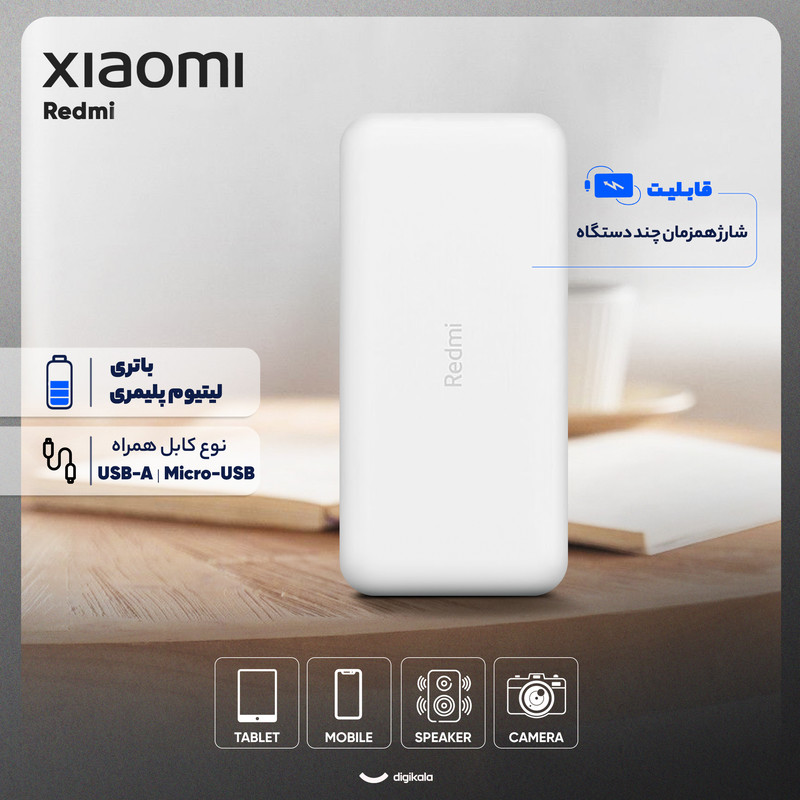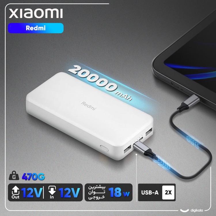 پاوربانک شارژر همراه 18 وات شیائومی مدل Redmi ظرفیت 20000 میلی آمپرساعت به همراه کابل تبدیل microUSB
